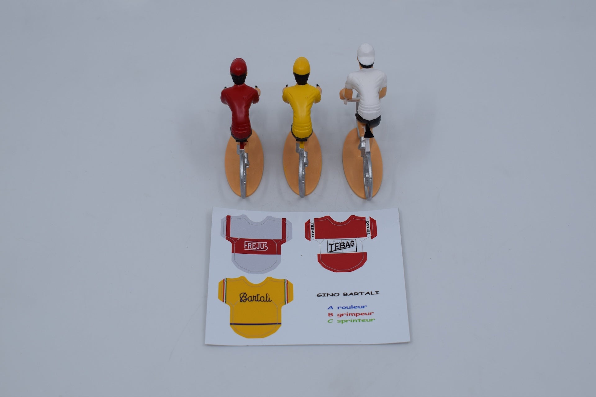 Een gevarieerde set aan miniatuurfietsen met de meest legendarische truitjes waar Gino Bartali mee gereden heeft.