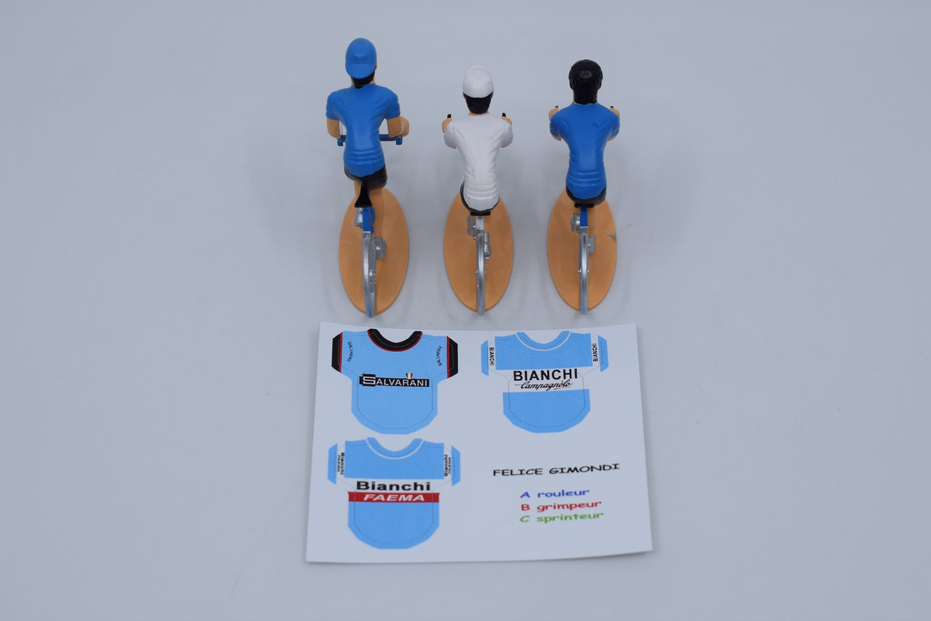 Een gevarieerde set aan miniatuurfietsen met de meest legendarische truitjes waar Felice Gimondi mee gereden heeft.