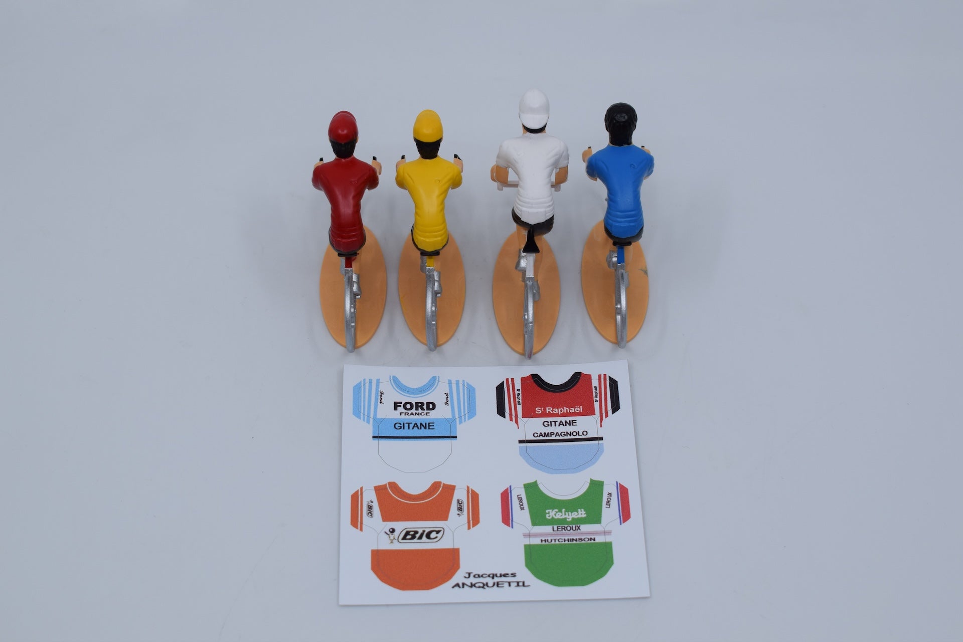 Een gevarieerde set aan miniatuurfietsen met de meest legendarische truitjes waar Jacques Anquetil mee gereden heeft.