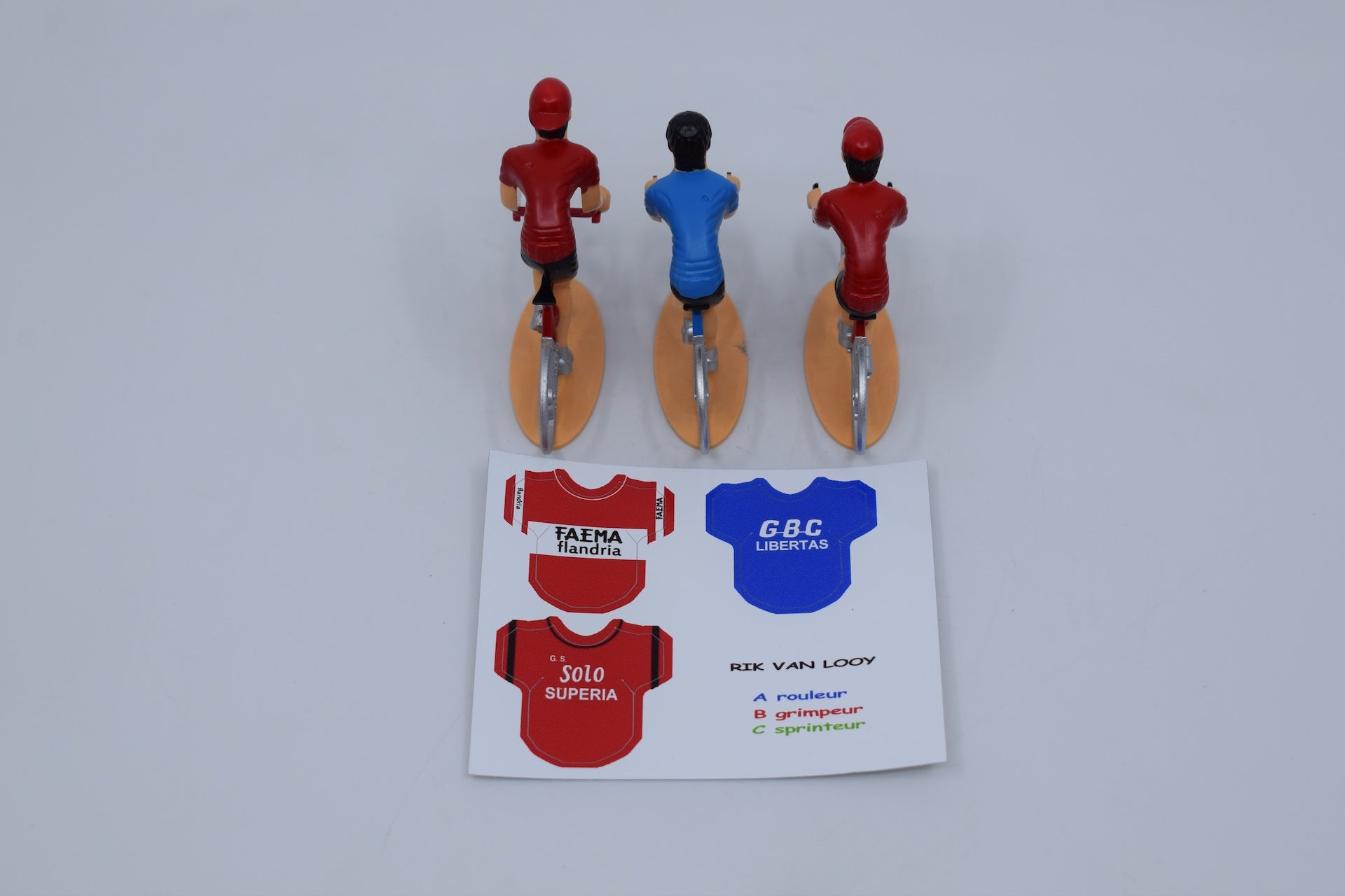 Een gevarieerde set aan miniatuurfietsen met de meest legendarische truitjes waar Rik Van Looy mee gereden heeft.