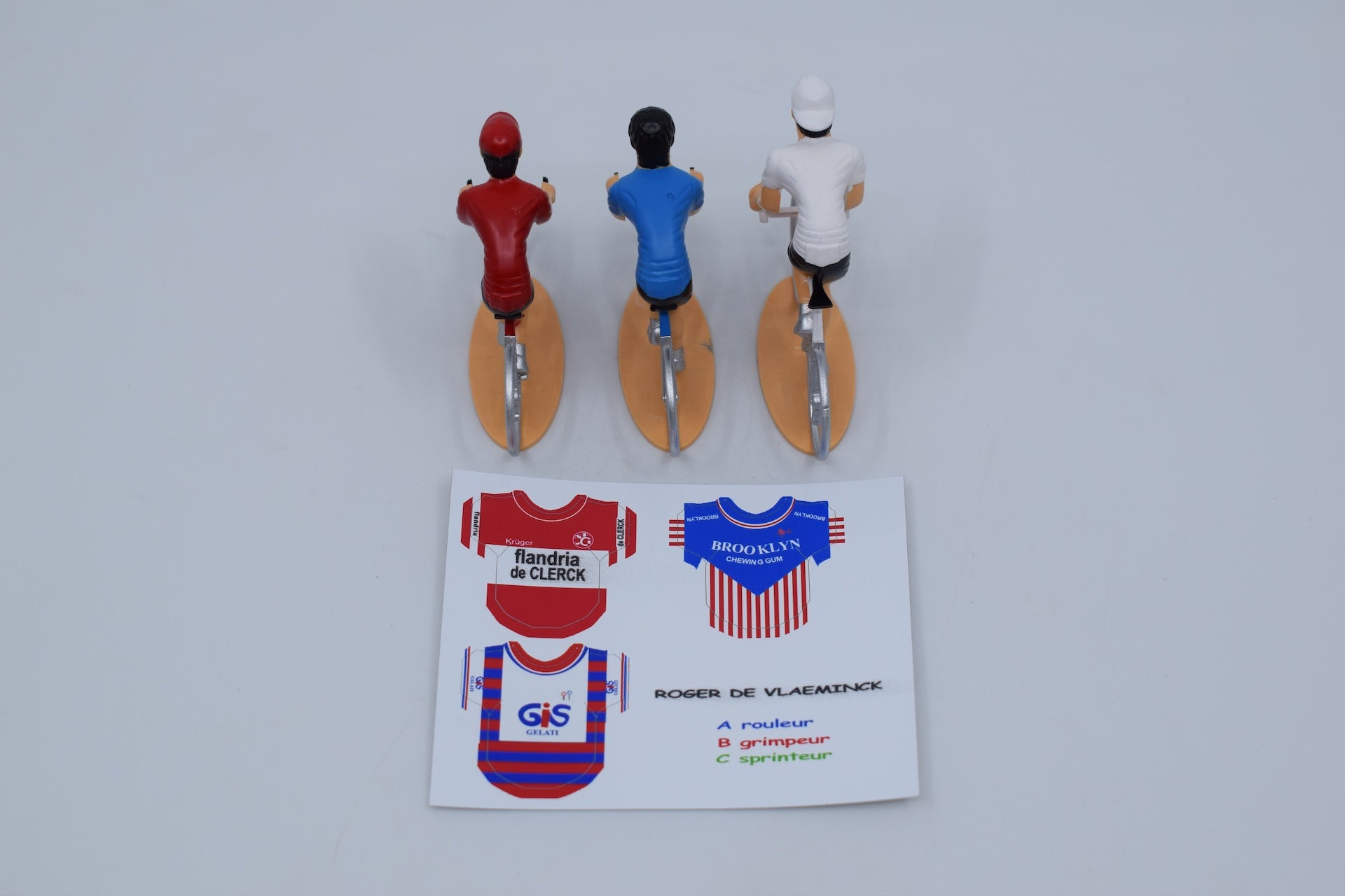 Een gevarieerde set aan miniatuurfietsen met de meest legendarische truitjes waar Roger De Vlaeminck mee gereden heeft.